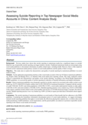 366 social media posts reporting suicide. This study conducted content analysis to demonstrate the characteristics and quality of the suicide reporting. According to the World Health Organization (WHO) guidelines, we assessed the quality of suicide reporting by indicators of harmful information and helpful information [...] Conclusions: The suicide reporting of mainstream publishers on social media in China broadly had low adherence to the WHO guidelines. Considering the tremendous information dissemination power of social media platforms, we suggest developing national suicide reporting guidelines that apply to social media. By effectively playing their separate roles, we believe that social media practitioners, health institutions, social organizations, and the general public can endeavor to promote responsible suicide reporting in the Chinese social media environment." (Abstract)