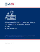 of terminology frequently used to discuss ICT4E. Section 5 presents the 10 key principles to which USAID adheres when conceptualizing, designing, and implementing ICT in education systems. Section 6 provides a condensed description of the growing body of evidence for ICT4E around the world and provides useful sites and resources as reference. Section 7 offers an extended examination of the opportunities for technology to support challenges within the education system and resources to help education staff and implementing partners understand and clearly communicate the case for integrating ICT approaches into associated education activities. Section 8 contains a matrix that education staff and implementing partners can use to integrate ICT at various stages of the USAID Program Cycle. It begins with country strategic planning and moves into project and activity planning, design, and implementation phases. The matrix also contains guidance for ensuring that monitoring, evaluation, and learning capture how interventions are performing according to established goals and targets for ICT usage." (Page 1)