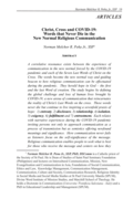 mic. They herald hope in God – the first and the last Word of creation. The study begins by defining the global challenge and loss of human lives brought by COVID-19, a new arena of communication that reincarnates the reality of Christ’s Last Words on the cross. These words never die but continue to live inspiring a sevenfold praxis of hope: 1) entreaty, 2) disclosure, 3) relationship, 4) isolation, 5) exigency, 6) fulfillment and 7) entrustment. Each relates with narrative experiences during the COVID-19 pandemic inviting persons not only to approach communication as a process of transmission but as semiotics offering newfound meanings and significance. Here communication never fails as listeners focus on the self-significance of the message. Religious communication enables people to seek what is best for those who receive the message and centers on how they could grow not only in faith but likewise as human beings who bear God’s image and likeness also in the time of the pandemic." (Abstract)