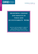 attempt to make any judgement about the indicators identified, as this work will be further developed under DFID’s ‘Suggested Indicators for Governance’ work, due in 2010. The paper is intended for DFID advisers and managers working on V&A initiatives at the country level. It will also be of use to people outside DFID who are interested in understanding how V&A work contributes to development outcomes; or who want more information about data collection methods for V&A measurement. V&A interventions range from work with governments on policy and reform processes, to activities at community level on civic education and rights awareness. DFID supports a significant amount of V&A work through government and non-state actors, in sector programmes and in work with civil society organisations including the media. We now need to establish the evidence base to show what change has resulted." (Executive summary)