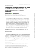 "We propose deception as a bridging concept that will enhance the study of misinformation, disinformation, and misperceptions. As we set it out here, the concept integrates insights from multiple social science disciplines and uniquely connects actors’ intentions, information, and attitudinal or b