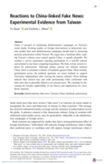 n's citizens more united against China, is equally plausible. We conduct a survey experiment exposing participants to a real-life rumour and rebuttal to test these competing hypotheses. We find, at best, mixed evidence for polarization. Although neither rumour nor rebuttal mention China, there is consistent evidence of backlash against China. Most notably, participants across the political spectrum are more inclined to support Taiwanese independence after viewing the rumour rebuttal. These findings indicate that citizens may put aside partisanship when confronted with false news that is plausibly linked to an external actor. We conclude by discussing the broader applicability of our theory and implications for cross-Strait relations." (Abstract)