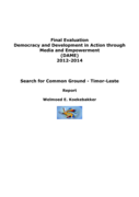 ctivities strengthening youth leadership (Youth Forums and Civic Leadership trainings). Some 2500 youth all over Timor-Leste learned about the very skills needed for democracy. This is a promising contribution to strengthening the democratic process. 3. Core elements of the DAME approach - inclusiveness, NSA-SA collaboration, conflict prevention, and a consistent focus on youth and women - are highly relevant in view of the social, political and postconflict context in Timor-Leste, in particular by contributing to (and complementing) current government approaches. 4. However, the Action was over-ambitious in terms of objectives, partners with mixed capacities, activities, and target groups, covering all districts, and as a consequence some Action components suffered from insufficient in-depth development of quality, follow-up, coherence and cross-fertilization." (Executive summary)