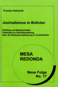 (Journalistinnen und Konfliktparteien) und einer Inhaltsanalyse von vier Tageszeitungen wurde im Rahmen einer Diplomarbeit im Studiengang Journalistik der Katholischen Universität Eichstätt-Ingolstadt versucht, genau ein Jahr nach der Eskalation des Konflikts das Geschehen teilweise zu rekonstruieren. Besonders durch die qualitativen Methoden der Beobachtung und freier Interviews gelang ein recht guter Einblick in die Arbeitsweise der Journalistinnen. Einige Hintergründe zu Einflüssen während des Wasserkriegs konnten aufgedeckt werden. Ziel dieser Arbeit ist es aber nicht, einzelnen Personen Schuld nachzuweisen. Vielmehr geht es dem Verfasser darum, jene Strukturen verständlich zu machen, die einen unabhängigen Journalismus in Bolivien unwahrscheinlich machen. Die Berichterstattung über die Wasserprivatisierung soll lediglich als Fallbeispiel dienen, an dem bestimmte Einflussfaktoren und deren Wirkungsweise aufgedeckt und eingeordnet werden können." (Abstract)