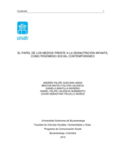 realizaron: Grupos focales en el barrio Don Bosco y Santander, encuestas en el Instituto Técnico Superior Dámaso Zapata y Colegio Franciscano del Virrey Solís de Bucaramanga. De igual forma, se llevaron a cabo entrevistas y grupos focales con periodistas de diferentes medios de comunicación de la región y entrevistas a candidatos de las elecciones legislativas.Los diseños metodológicos utilizados fueron: Crítico (Creswell,2005) Sistemático (Corbin y strauss,2007), Realista o mixto (Creswell,2005), Codificación Selectiva (Corbin y Strauss,2007), Etnográfica de corte transversal (Joyceen Boyle En Álvarez- Gayou, 2003) y Diseño narrativo (Creswell, 2005).Como resultado final se concluyó que los medios de comunicación no abarcan la problemática de desnutrición infantil en Bucaramanga, únicamente se centran en el ámbito de la corrupción y sus consecuencias. En este caso, quienes se ven afectados son los niños al dejar de recibir los alimentos estipulados por el gobierno según el Plan de Alimentación Escolar (PAE)." (Resumen)