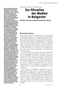 Als Handelsgesellschaften registriert, entziehen sich die Medien in der Regel einer Kontrolle ihrer Finanzierungsquellen. Ausländische Investoren fördern zwar die Modernisierung etwa der Printmedien, behindern aber durch ihre Preisgestaltung die Etablierung einer unabhängigen Presse. Beherrscher des Printmedienmarktes sind die WAZ-Gruppe mit Produkten wie Trud, 24 tschassa und 168 tschassa sowie das auf Wirtschaftsthemen spezialisierte Verlagshaus Economedia. Im Rundfunk- und TV-Bereich, der durch das Hörfunk- und Fernsehgesetz reguliert ist, wacht der Rat für elektronische Medien über die Einhaltung von Bestimmungen etwa zu Werbung, Urheberrecht und Jugendschutz. Doch fördern weder die Politik des Rats selbst noch die Besitzverhältnisse der Einzelmedien deren tatsächliche Freiheit und programmatische Souveränität. Als weitgehend unabhängig gilt allenfalls das Internet. Die Zeiten sind nicht günstig für anspruchsvolle Medien und einen selbstbewussten, investigativen Journalismus in Bulgarien. Zu hoffen bleibt nur, dass die zunehmende Verwurzelung des Landes in Europa auf lange Sicht positiv wirkt." (Seite 6)