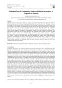 can be put to. This study explores the “would be” relationship between community radio and political awareness especially at the grassroots in Nigeria. Using a survey of radio producers, announcers, correspondents, reporters and other broadcast professionals who understand the concept and have had some experience with community radio elsewhere, the study finds that effective programme selection and scheduling will be essential to raising political awareness in Nigerian communities when such stations start operation. Also, interactive approaches in radio programme production will give listeners a chance to clear their doubts and seek illumination on complex issues. Radio producers, announcers, correspondents and reporters should realise that community radio will be a viable tool in raising political awareness in Nigeria, only if used appropriately. Lessons from other countries (where strategies in raising political awareness via community radio have been successful) should be learnt and used when community radio sets foot in Nigeria." (Abstract)