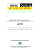 "This Nationwide Media Audience Survey 2006 is the most comprehensive and representative media survey carried out in Papua New Guinea to date. Regular media surveys for commercial purposes have been carried out, concentrating on urban and peri-urban samples in the five most-developed major centres. ... more
