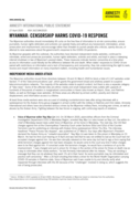 n to punish people who criticize, openly discuss, or attempt to raise awareness about the government’s response to the COVID-19 pandemic. As Myanmar grapples with the outbreak, the authorities have blocked independent media websites; continued to intimidate, arrest and prosecute journalists, human rights defenders, activists and artists; and kept in place a sweeping internet shutdown in two of Myanmar’s poorest states. These measures indicate harsher censorship at a time when access to information could literally be the difference between life and death. When states’ responses to COVID-19 are paired with restrictions on information and a lack of transparency and censorship, they risk undermining the right to seek, receive and impart information on many important matters, including health and humanitarian issues." (Page 1)