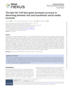 through inauthentic or “troll” accounts that appear to be trustworthy members to the targeted polity, as in Russia's attempts to influence the 2016 US presidential election. We experimentally tested the efficacy of inoculation against inauthentic online actors, using the Spot the Troll Quiz, a free, online educational tool that teaches how to spot markers of inauthenticity. Inoculation works in this setting. Across an online US nationally representative sample (N = 2,847), which also oversampled older adults, we find that taking the Spot the Troll Quiz (vs. playing a simple game) significantly increases participants’ accuracy in identifying trolls among a set of Twitter accounts that are novel to participants. This inoculation also reduces participants’ self-efficacy in identifying inauthentic accounts and reduced the perceived reliability of fake news headlines, although it had no effect on affective polarization. And while accuracy in the novel troll-spotting task is negatively associated with age and Republican party identification, the Quiz is equally effective on older adults and Republicans as it was on younger adults and Democrats." (Abstract)