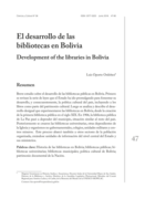 "Breve estudio sobre el desarrollo de las bibliotecas públicas en Bolivia. Primero se revisan la serie de leyes que el Estado ha ido promulgando para fomentar su desarrollo, y consecuentemente, la política cultural del país, incluyendo a los libros como parte del patrimonio cultural. Luego se ana