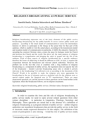 urgy at the actual time for that part of the audience, which is unable to visit the actual place), according to the transmission model and reception model of communication in particular, it fulfils the educative function by spreading the common Christian values, creates the space for dialogue inside the Church and between the Church and the world. But above all, the main purpose of religious broadcasting is evangelization and bringing the spirit of gospel into the life of the audience. Each of these aspects of religious broadcasting has a specific audience; therefore the forms of addressing it should be different as well. At least, it requires the cooperation between the broadcaster and relevant church authorities. However, the problem lies in the fact that even in countries with a long tradition of religious broadcasting as a component of public service, the legislation does not specify the role of the broadcaster – should it provide broadcasting space only or should it actively intervene in the broadcasting? Is it allowed to do so according to the documents of the Church? Would it be possible to make the religious acts more appropriate for broadcasting by the use of elements such as a preferred style for the religious texts or special camera angles for liturgical acts in TV transmissions? There are many unanswered questions yet, and the answers to these questions can be found neither in the legislation, which the broadcaster follows, nor in religious documents." (Abstract)