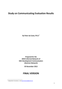 state of evaluation of the efforts undertaken by OECD aid agency communicators themselves: looking at whether, to what extent and how donors monitor measure and evaluate the effectiveness and impact of their communication strategies. First, the study will highlight key trends that have shaped the communication context for development evaluation. Second, and in separate sections, it will reflect on the evaluation and communication perspective around communicating results. For each of the two disciplines, and with reference to results of recent surveys, the paper will reflect on questions of definition, mandate, track record, challenges, and status of collaboration, and reference examples of emerging good and bad practice. Third, it will highlight the dynamics around communication of ‘negative’ or ‘sensitive’ evidence, identified by both evaluators and communicators as among the biggest challenges to be addressed. Fourth, it will look at how systematically agency communication strategies and initiatives are evaluated, exploring the extent to which evaluators and communicators work together in assessing these strategies. Fifth, the study will reflect on the experience to date in involving partner countries in communicating evaluation results, before concluding with a series of proposals aimed at improving collaboration between evaluators and communicators." (Introduction)