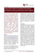 social media content in the form of infographics, short factual films, still photographs, short drama skits and Public Service Announcements were produced and posted under the EU SDGN project (and MI-VotE project) across our BBC Media Action Arewa (Hausa) and Naija (English) Facebook and Instagram platforms to share balanced information on electoral and political processes, role model political participation, and engage young Nigerians in social issues that matter to them. The project also strengthened the capacity of media organisations across Nigeria to provide more trusted, accurate and balanced social media content that meets audience needs." (Page 1)