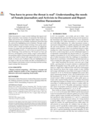 ries of injustice. Through a multi-phased qualitative research study involving a focus group and interviews with 27 female journalists and activists, we mapped the journey of a target who goes through harassment. We introduce PMCR framework, as a way to focus on needs for Prevention, Monitoring, Crisis and Recovery. We focused on Crisis and Recovery, and designed a tool to satisfy a target’s needs related to documenting evidence of harassment during the crisis and creating reports that could be shared with support networks for recovery. Finally, we discuss users’ feedback to this tool, highlighting needs for targets as they face the burden and offer recommendations to future designers and scholars on how to develop tools that can help targets manage their harassment." (Abstract)