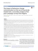 "Mass distribution campaigns of insecticide-treated nets for malaria prevention are usually accompanied by intensive behaviour change communication (BCC) to encourage hanging and use of nets. However, data on the effectiveness of these communication efforts are scarce. In preparation for the next ro