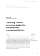 "This study examines the challenges of good governance for community radio stations. It does this by exploring how volunteers, managers and members of the Boards of Directors at four community radio stations in Ireland view governance issues. The article finds that there are three key requirements f