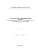 comunicar el rostro misericordioso de Dios. Su estilo de comunicación se caracteriza por comunicar con el cuerpo y las palabras. Es una comunicación creadora de encuentros. Esto implica apertura a los demás, valorar a los otros. El Papa crea diálogos con espontaneidad, lo que se observa cuando interrumpe un discurso para dar espacio al diálogo y mirar al auditorio que le escucha. De esa manera, el Papa da confianza a la gente y se hace más cercano." (Conclusión, páginas 119-120)