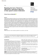 mative justice frameworks as alternative approaches to platform governance to mitigate harms caused to marginalized users. As a complement to these recent calls, in this essay, I take up the concept of reparation as one substantive approach social media platforms can use alongside and within these justice frameworks to take actionable steps toward addressing, undoing and proactively preventing the harm caused by algorithmic content moderation. Specifically, I draw on established legal and legislative reparations frameworks to suggest how social media platforms can reconceptualize algorithmic content moderation in ways that decrease harm to marginalized users when identifying hate speech. I argue that the concept of reparations can reorient how researchers and corporate social media platforms approach content moderation, away from capitalist impulses and efficiency and toward a framework that prioritizes creating an environment where individuals from marginalized communities feel safe, protected and empowered." (Abstract)