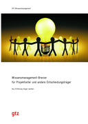 h ersetzt keine kohärente Wissensmanagement-Strategie. Diese muss stets im Einzelfall definiert und umgesetzt werden. Das Handbuch schlägt eine Schrittfolge, eine Methodik und Instrumente vor, die einen Überblick über die relevanten Fragen bieten. Es muss aber nicht in jedem Fall in dieser Weise umgesetzt werden. Das Handbuch empfiehlt sich, als Einstieg und Ergänzung für einen systematischen, durch geeignete Experten begleiteten Veränderungsprozess. Das Handbuch basiert auf Erfahrungen der GTZ und ihrer Partner. Es geht aus der Einführungsveranstaltung für neue Mitarbeiter der GTZ hervor. Die Inhalte wurden für die Fortbildung von Fach- und Führungskräften der Partnerinstitutionen angepasst. Regionale Expertennetzwerke entwickeln es laufend weiter." (Ziel des vorliegenden Handbuchs, Seite 3)