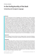 a rather multinational character. It is a place of worship for populations that consider Christian Orthodox culture part of their long-established collective identity and for recent converts. Based on ethnographic research, archival work and theoretical contextualisation, the article examines the atmospheric materiality of the written text as performed by the readers, the choir and the clergy. This soundscape is an amalgam of different kinds of reading: prose, chanted prose, chanting and antiphonic, depending the part of the Liturgy being read. The language of the book is performative: the choreography and its symbolisms perform the words of the texts and vice versa. Additionally, the use of at least four languages in every service and two Eastern Orthodox chanting styles in combination with European influences expresses in the most tangible way the religious inclusivity that has been carefully cultivated in this parish. Through closer examination of literary transformation processes, I demonstrate the role of liturgical language in the creation of communal space-times that negotiate ideas of home and belonging in a new land." (Abstract)