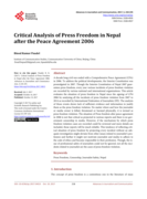 are recorded by various national and international organizations. This article evaluates the situation of press freedom in Nepal since the signing of CPA 2006 by analyzing all the incidents of press freedom violation from 2007 to 2014 as recorded by International Federation of Journalists (IFJ). The analysis of those events shows lack of sufficient evidence and information to justify them as the press freedom violation. No matter where and how the journalist or media owner is killed, threatened or harmed physically, it is termed as press freedom violation. The situation of Press freedom after peace agreement in 2006 is not that critical as projected in various reports and there is no government censorship in media. However, if the mechanism by which press freedom violation cases are recorded could be reviewed and more details are included, those reports will be much reliable. This tendency of reflecting critical situation of press freedom by projecting every incident without an adequate investigation might deviate from other issues related to journalist’s profession and further it might not motivate journalist and media to adhere to the code of ethics and become responsible to their profession. Though, the issue of professional safety of journalists could not be ignored, not all the incidents related to journalist are the cases of press freedom violation." (Abstract)