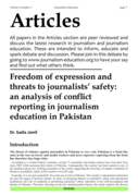 udy, journalists’ feedback reveals that not only their lives but their right to freedom of expression is at risk because of the prevailing unsafe environment in Pakistan. The study suggests journalism is a dangerous profession in Pakistan because of physical, psychological, financial, social, emotional and topic-specific risks, which constrain journalists’ right to freedom of expression and affect them most while doing their routine jobs. Despite the unsafe environment and constant threats, this study indicates that only 18% of surveyed journalists have received safety training to protect themselves in conflict and non-conflict situations. The following questions need to be addressed when analysing issues around journalists’ safety training in Pakistan, namely: who are the trainers? Are trainers themselves trained for journalists’ safety training, bearing in mind the local safety circumstances? What is the role of local and international NGO’s in promoting journalists’ safety education either at university or media organisational level? Further research on these aspects is crucial for the better training of journalists. This study reveals that the education of conflict reporting and peace journalism is not the major part of journalism curricula in Pakistan’s public and private sector universities. The curriculum in most of the universities do not reflect distinctively the local aspects of journalism teaching and approaches, which is important for enabling journalists to understand the context within which they perform their work. As highlighted by Abit and Kenneth in their article, the case of Kosovo is quite similar to Pakistan – where journalism education lacks local teaching approches. Therefore, in this article, I emphasize certain initiatives such as: the inclusion of journalists’ safety and peace journalism modules in curriculum; collaboration with international universities for innovative pedagogical models; regular curriculum revision and local-context teaching and research within this field. Others have underlined the need for a few more significant inititatives that I think are crucial as far as journalists’ safety education is concerned, such as: enhancing journalists’ awareness of their rights and physical and psychological safety; protection of their equipment, and legal protection while covering war or conflict." (Conclusion)
