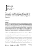 he procedures of the press complaints body to some degree, and replacing the selfregulatory system with one of independent co-regulation. A significant change to the system, in January 2013, was the introduction of the allowance of third-party complaints. In an environment of increasing perceived threats to press freedom from government, and acknowledging the low public profile of the press accountability body, the introduction of third-party complaints enables the raising of public awareness about the purpose of the Press Council of South Africa and its relationship to the defence of press freedom, in a format which was not previously possible." (Abstract)