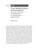 issues in the larger field of media studies, as well. Early modernization theories followed by the Latin American critique and subsequent rise of participatory communication reflect many of the same concerns that emerged from the effects tradition challenged by critical theorists and leading to both political economic and cultural studies orientations. Issues regarding individual–psychological versus cultural–contextual orientations, quantitative versus qualitative methods, and value-free versus power-laden positions have marked the conceptual advancements of both development communication and media studies. Moreover, criticisms of linear, transmission models of communication have created greater sensitivity to process, meaning centered conceptualizations of the relationship between media and society. While these struggles and contributions have reshaped communication methods, theories, and practices, the future direction of research continues to be debated." (Pages 65-66)