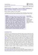 a on political and economic performance with Worlds of Journalism Study (WJS) survey data on journalists’ institutional trust, watchdog and loyalty roles, editorial autonomy, professional experience, and news media ownership. Derived from interviews with 27, 657 journalists from 67 countries included in the second wave of the WJS (2012–2016), results show that democracy and press freedom are negatively correlated with journalists’institutional trust. Quite notably, autonomous and watchdog journalists are less trusting than loyal journalists. The findings also suggest that corruption levels, annual economic growth, and type of media ownership are essential determinants in this regard." (Abstract)