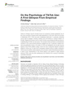 ng, and commenting on “LipSync-Videos” on the app. Despite its success in terms of user numbers, psychological studies aiming at an understanding of TikTok use are scarce. This narrative review provides a comprehensive overview on the small empirical literature available thus far. In particular, insights from uses and gratification theory in the realm of TikTok are highlighted, and we also discuss aspects of the TikTok platform design. Given the many unexplored research questions related to TikTok use, it is high time to strengthen research efforts to better understand TikTok use and whether certain aspects of its use result in detrimental behavioral effects. In light of user characteristics of the TikTok platform, this research is highly relevant because TikTok users are often adolescents and therefore from a group of potentially vulnerable individuals." (Abstract)