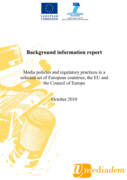 , Finland, Germany, Greece, Italy, Romania, Slovakia, Spain, Turkey and the UK), probing into the historical forces, national traditions and distinct political and socio-economic contexts in which media policies have emerged and developed. The analysis explores the main instruments for media regulation in the countries under study, and assesses the implications of the established media policy strategies for democratic politics. The country chapters follow a similar structure. Following a brief introduction, the analysis focuses on the media landscape of the countries under review, offering an overview of the national media market (the press, broadcast media, online media and news agencies), as well as a discussion of the status of the journalistic profession and media literacy. The third section presents the major actors involved in media policymaking and proceeds with a succinct presentation and explanation of the national regulatory framework for the media, focusing mainly on structural and content regulation. The final section provides a critical assessment of the principal issues and trends that characterise the media policies of the countries under study, together with an assessment of the degree to which they enable the media to feed the democratic process. The report also contains a chapter discussing the media-related initiatives of the European Union and the Council of Europe, focusing on the interventions that are of relevance and importance to the protection and promotion of media freedom and independence." (Introductory note, page 10)