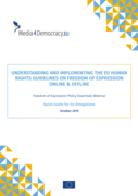 the Council of the European Union (EU) in 2014. The Guidelines provide a policy and operational foundation for EU Delegations, EU institutions and Member States working to support freedom of expression and media pluralism. The Guidelines also present good practice approaches to responding in strategic and systematic ways to the challenges of promoting and protecting freedom of expression in diverse contexts [...] This Quick Guide provides a summary of the Guidelines alongside information designed to support EU Delegation staff working in third countries, focusing first on: What EU Delegations Need to Know; then on: What EU Delegations Can Do." (Introduction, page 5)