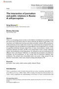 news content. On a theoretical and conceptual level, the aims and goals of the two professions are quite different, even though there are a number of superficial similarities between these forms of mass communication. Studies of the interaction between journalism and PR in the United States reveal a certain underlying tension, yet simultaneous mutual dependency. An indicative survey was conducted across different cities in the Russian Federation to understand the perception of professional journalists and PR practitioners on the current level of interaction between their professions. The answers were remarkably similar and reveal a deep concern for the direction of journalism, which many viewed as being subordinated to PR." (Abstract)