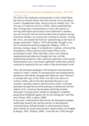 uently concluded that development communication has a positive impact on social structure as they also did in 1987-1996. One difference is that negative impact on social structure is much less frequently mentioned as a conclusion in 1997-2006. Studies in 1997-2006 do not often conclude that there are positive impacts of development communication on individuals, while in 1958-1986, this was one of the most common conclusions, mentioned in one-quarter of all studies. Another important finding in the 1997-2006 period is the apparent dissatisfaction with the state of the art in theory and research in development communication. Aside from urging attention to development theory, the studies also urged more attention to development communication campaign planning by taking into account, local culture, gender issues, and multimedia delivery of information, and to improving research methods." (Conclusions in development communication research)