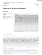tion in which such assumptions—on development, the role of ICTs towards it, and the meaningfulness of the term “developing countries”—have been problematized. As a result, this paper poses the question on whether it still makes sense to do ICT4D research: starting from older ICT4D landscape papers, it fleshes out three main assumptions made at the origins of the field. It then problematizes such assumptions through more recent works, noting that the old theoretical grounds of the field do not apply anymore today. Having said that, it states three reasons for renewed ICT4D research efforts: the reframing of “development” in terms of justice, the potential of multi-theoretical research approaches, and the turn to indigenous understandings of ICTs. For all these reasons, it concludes that doing ICT4D research is especially important today, in virtue of a juncture of history that problematizes its older assumptions." (Abstract)