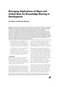Governments, companies and non-governmental organisations (NGOs) across the world are increasingly exploring how the publication and use of open and linked data can have impacts on governance, economic growth and the delivery of services. This article outlines the historical, social and technical trajectories that have led to current interest in, and practices around, open data. Drawing on three example cases of working with open and linked data it takes a critical look at issues that development sector knowledge intermediaries may need to engage with to ensure the socio-technical innovations of open and linked data work in the interests of greater diversity and better development practice." (Abstract)
