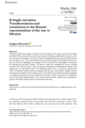 as not able to cover. This article analyses the core transformations of the Russian narrative on the war in Ukraine. Appealing to the strategic narrative concept, this article suggests a framework for assessing the narrative’s viability. The author reveals that, although the current modified narrative is not able to provide a clear and coherent explanation corresponding to people’s lived experiences, it is still effective due to the following reasons. First, it is built on and perceived within an intuitively familiar discursive landscape that has been promoted for decades. Second, the external prerequisites of the viability, such as the scale of its articulation through propaganda or existing opportunities to perceive alternative narratives, remain strong. Thus, it is likely that most of the rational argumentation in the narrative will be further replaced by its sacralization, and the information isolation will be continuously reinforced." (Abstract)