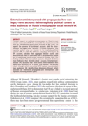 that regularly publish what we theorize to be ‘explicitly political content’ (EPC; N = 355). We delineate a typology of six types of EPC accounts, calculate their aggregate follower counts, and determine how many of them were still (1) accessible from Russia and (2) publishing Kremlin-critical content in October 2022. Our findings indicate that non-critical accounts attracted 26 times more followers than Kremlin-critical accounts. Entertainmentfocused EPC accounts had seven times more followers than legacy-news accounts. As a result, they became the primary means through which non-critical EPC reached news-avoidant mass audiences. We identify three dimensions through which autocrats can interweave propaganda and entertainment and highlight promising research paths." (Abstract)
