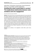 ngagement in society, a void this study has set out to fill. Based on a four-wave general population panel survey in the Netherlands, conducted between April and July 2020 (N = 1,084) during a crisis situation, this research-in-brief investigates the development of news avoidance and pro-social civic engagement over time. Results suggest that higher news topic avoidance results in higher levels of civic engagement. The study discusses different explanations for why less news can mean more engagement." (Abstract)