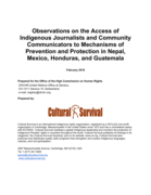 "This reports examines the situation of freedom of expression of indigenous journalists in four countries and analyzes data, where available, of Indigenous Peoples’ access to mechanisms charged with ensuring their safety. We present grassroots information from Nepal in English, and from Guatemala,
